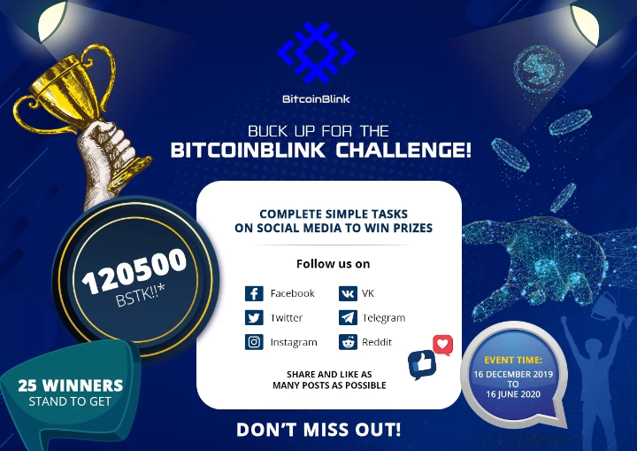 To celebrate the launch of our platform, we are starting BitcoinBlink challenge with a total prize of [120 500 BSTK!]