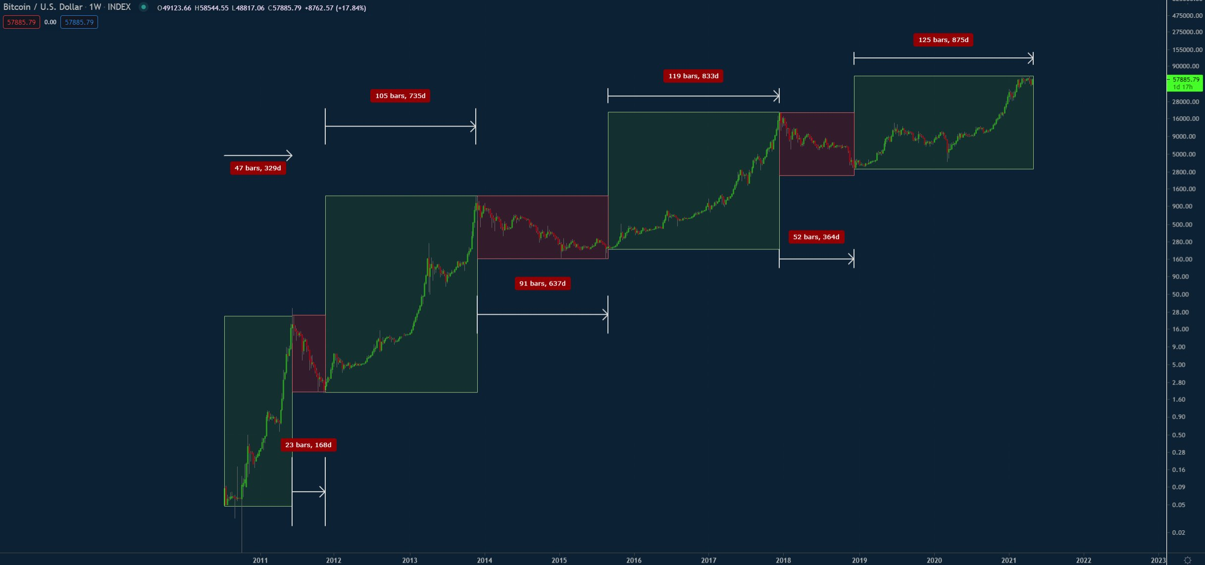 I don't think you can draw too many conclusions with this that can be of much use for future projections, but that's not to say that this is valueless data. One thing that I will say is that, using how these bear and bull market cycles were labeled in this chart, there are indications (at the time scale) that a macro-bull market top COULD already be in, or approaching very soon.