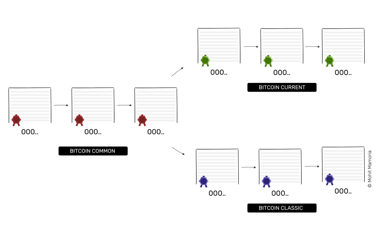 The ‘Bitcoin Common’ part of the chain is the part before the split. Miners with the upgraded computers will work on the ‘Bitcoin Current’ branch of the chain while the miners who are still on the old block size will form the ‘Bitcoin Classic’ branch of the chain.