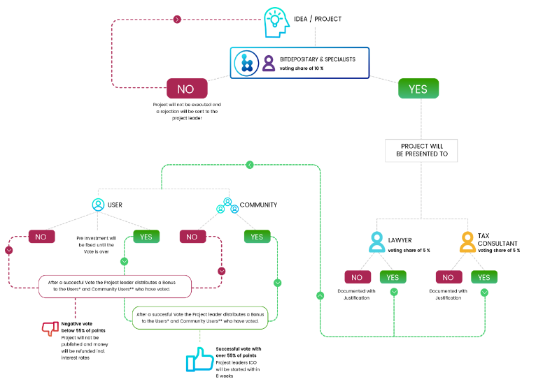 Пользователи получают свои жетоны бесплатно от владельца проекта, если проектом будет успешно достигнут softcap. Таким образом, каждая компания, которая представляет свой проект, должна тратить токены на всех, кто голосовал в поддержку или против проекта, используя систему Bitdepositary.