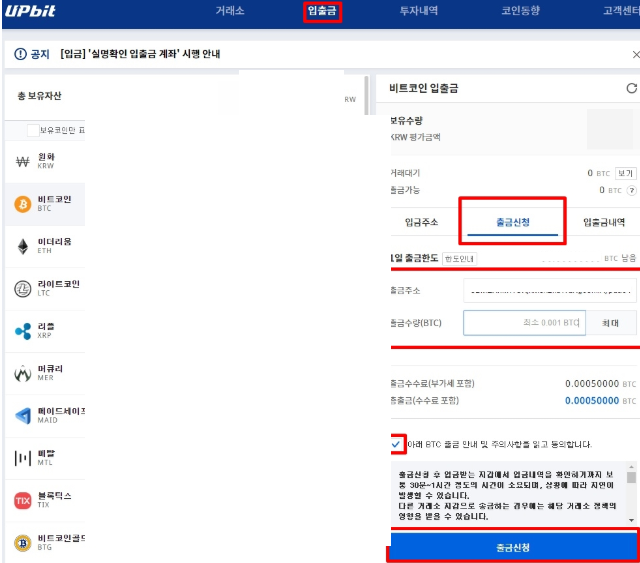업비트로 예로 들면 비트코인을 사서 입출금 클릭 보낼 수량만큼 적고 비트맥스에서 받은