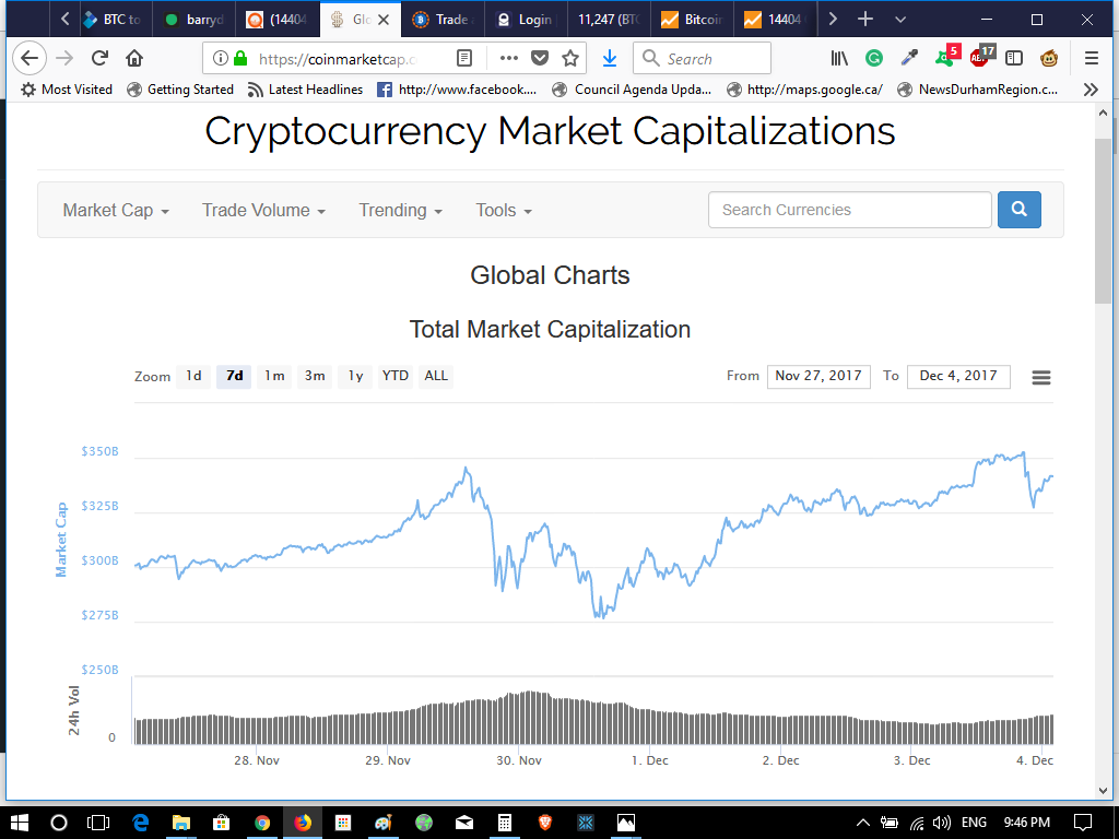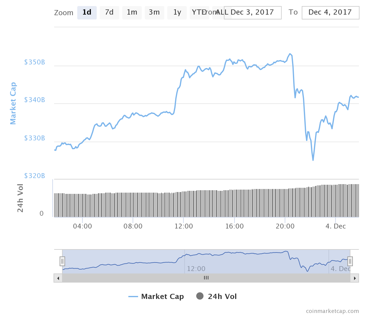 As of just now about 9:40 pm EST 12/3/2017: $340B total crypto market cap. After the big weekend/day today, we have pulled back $10B the last few hours to that $340B mark.