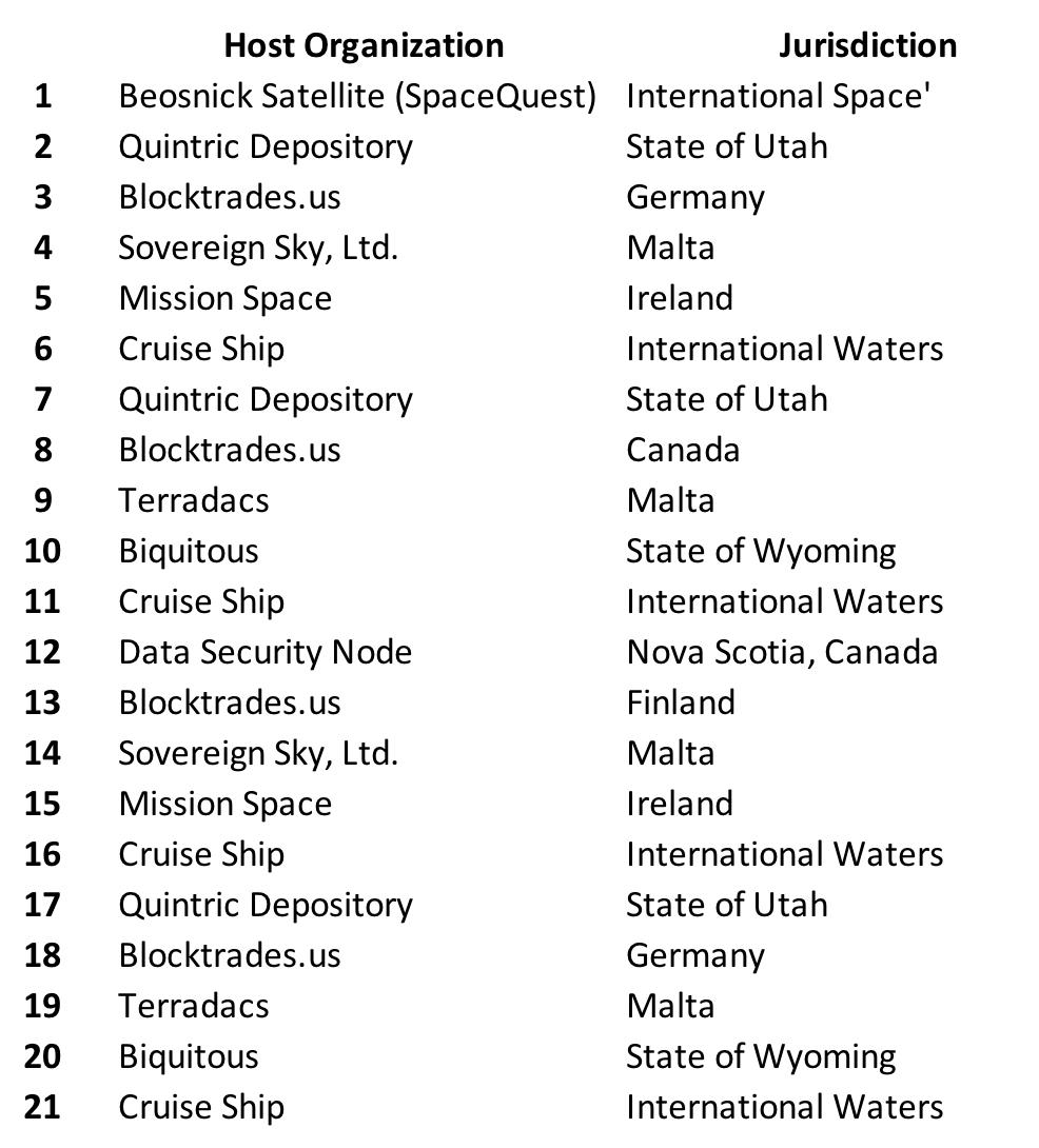 Block producing equipment will be highly specialized and located in specific predetermined locations. Elected block producers will have control over the software running on this equipment but not necessarily control over the machines physically unless they happen to be in the same location. This will ensure that nodes are run in specific jurisdictions and that the best possible equipment is being used. For example, nodes may eventually run in the following locations: on a satellite in space, on a ship at sea, in Utah, and in Ireland. When elected to the role of block producer, that individual or organization will be issued control over a specific instance of node hosting hardware while remaining responsible for providing backup hardware of their own choice.