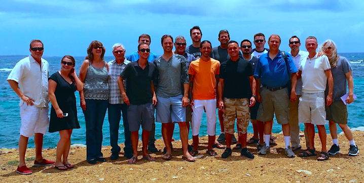 We go way back to 2014 when BitShares was first released. We met at this mastermind in St. Maartin in the summer of 2014. He's the tall poppy behind Michael Taggart standing to the left of Kevin Harrington of Shark Tank fame who is to the left of me - the hunk in the blue shirt wearing actual socks. That would be Dan Larimer peeping over Julian's head, three mugs to the left of Max. Those of you who go back a long way with us will recognize several others.