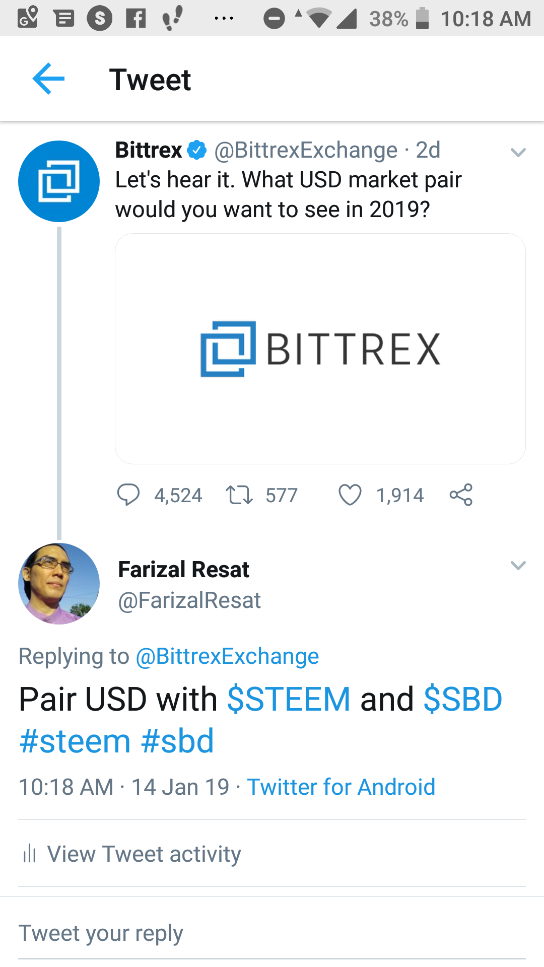Like us, leave a meaningful reply to #Bittrex (@bittrex) Tweet, telling them how important it is for the Steem community to make this Steem/USD Pairing happen.