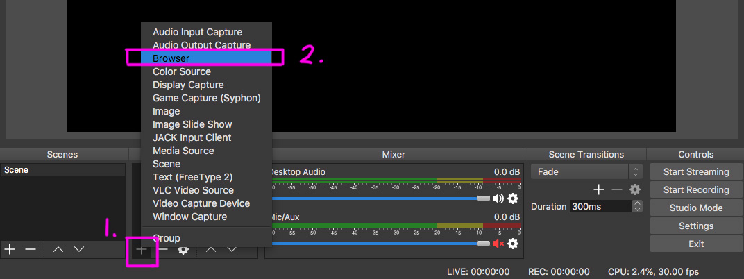 Open OBS and create a new Scene (if you need to) or add a new Source to a Scene you wish to add the chat to. The source type to select is the Browser source as we have a URL to use.