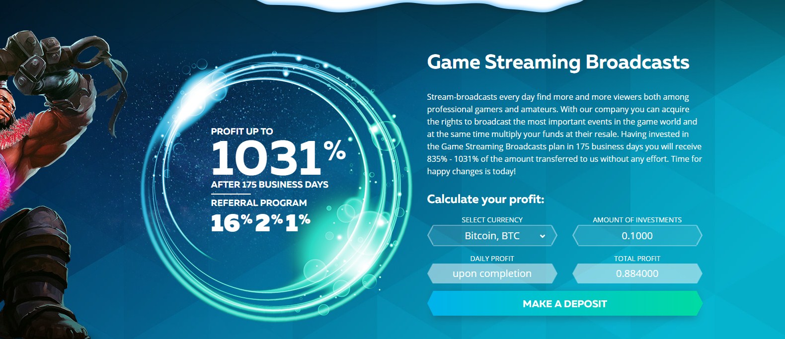 Stream-broadcasts every day find more and more viewers both among professional gamers and amateurs. With our company you can acquire the rights to broadcast the most important events in the game world and at the same time multiply your funds at their resale. Having invested in the Game Streaming Broadcasts plan in 175 business days you will receive 835% - 1031% of the amount transferred to us without any effort. Time for happy changes is today! Join here