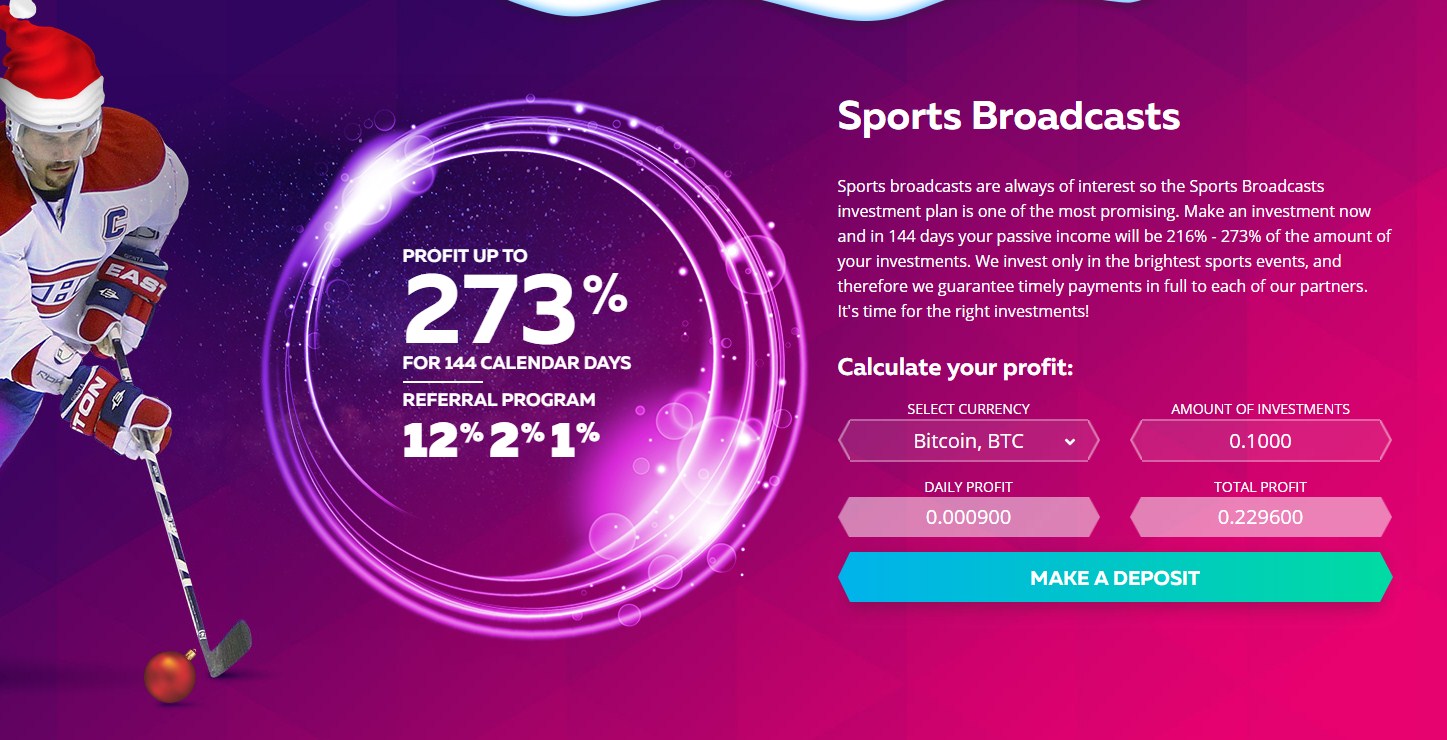 Sports broadcasts are always of interest so the Sports Broadcasts investment plan is one of the most promising. Make an investment now and in 144 days your passive income will be 216% - 273% of the amount of your investments. We invest only in the brightest sports events, and therefore we guarantee timely payments in full to each of our partners. It's time for the right investments! Join here