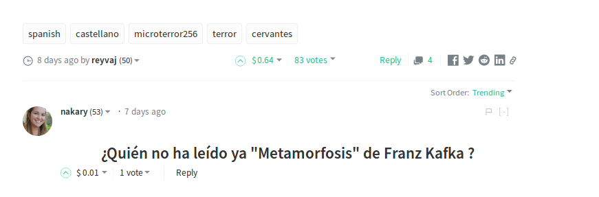 Kafka???? LMAOwalden (65)in #bla • 8 years ago (edited) Source https://steemit.com/spanish/@reyvaj/concurso-de-microrrelatos-de-terror-microterror256-semana-7-la-transformacion fuck!!! @nakary you are hardcore even by MY standards, but fine, good job. cc @talentclub @dresden #kafka