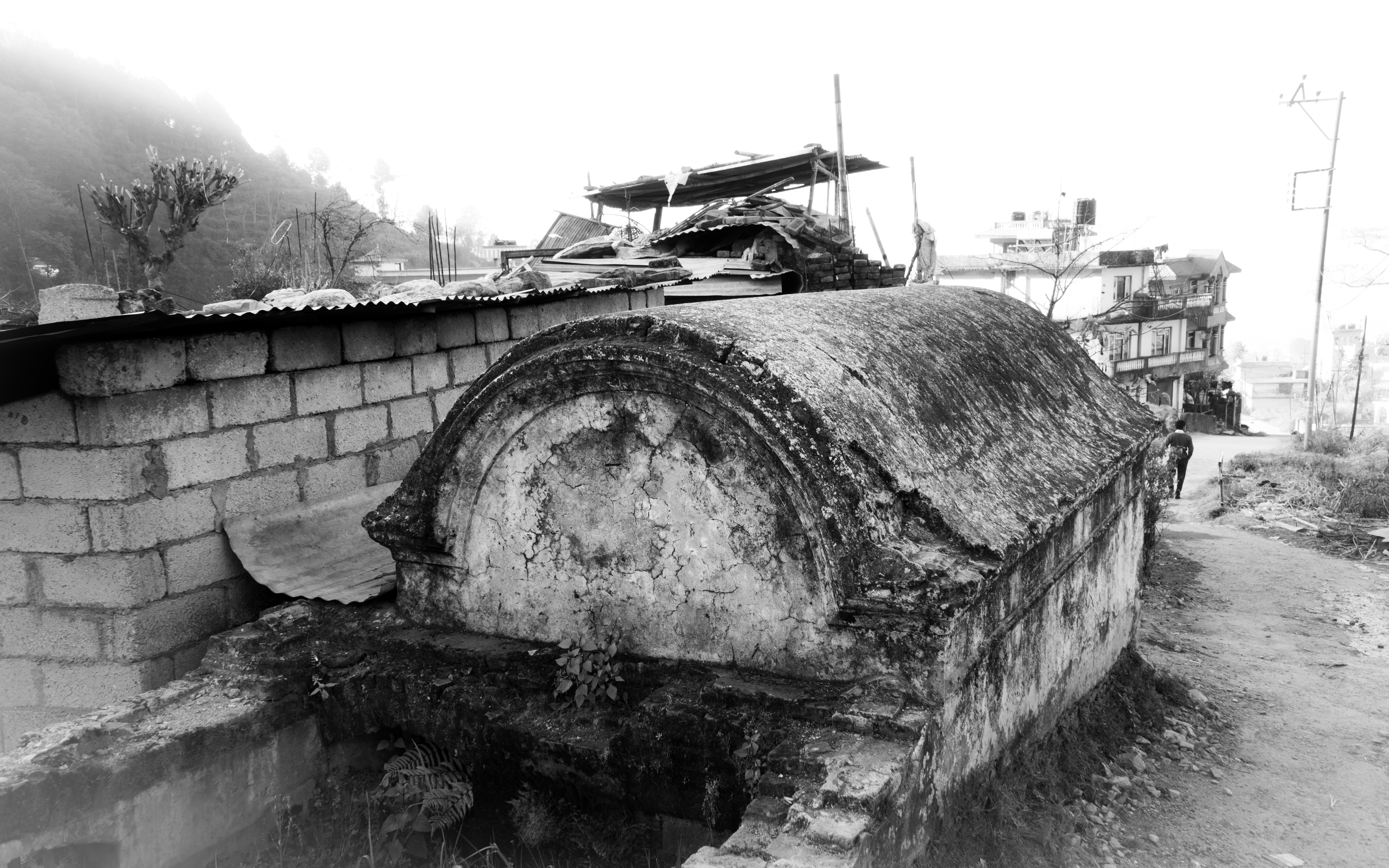 What is it?steemCreated with Sketch.philpotg (70)in Black and white • 2 months ago Hi all, Unusual construction sighted on the edge of the road in a Nepalese village on our way to see a mountaintop monastery on the mountain in the distance. CameraSony A6000 #blackandwhitephotography #travelphotography #phoography #steemphotos