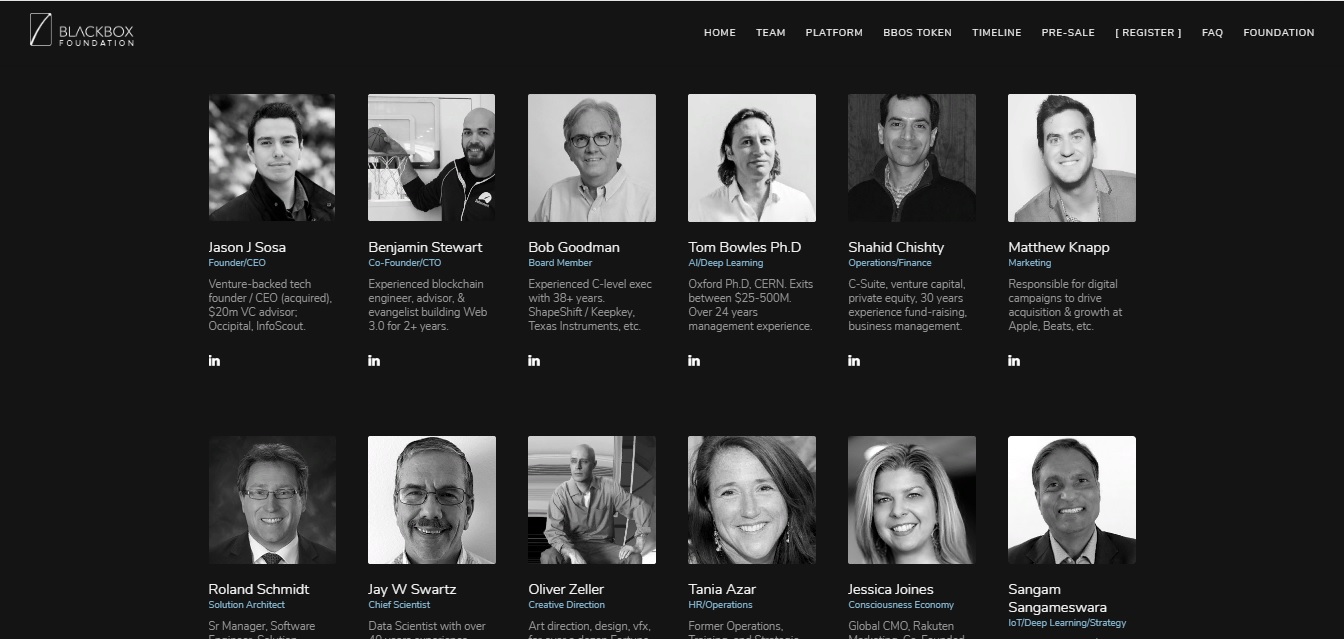 Это - некоммерческий фонд, на основе которого будет осуществлено построение платформы. Операционной деятельностью займется Blackbox AI, которая займется привлечением пользователей, сообществ и разработчиков на платформу. Blackbox Foundation - проект состоит из большой вполне сильной команды где трудятся более 60 человек, так же в команде присутствуют кандидаты наук а это уже неплохой плюс. Среди них такие личности как: Jason J Sosa (основатель проекта CEO); Benjamin Stewart (Соучредитель / CTO); Bob Goodman (Член правления); Tom Bowles Ph.D (AI / глубокое обучение); Shahid Chishty (Операции / Финансы); Matthew Knapp (Маркетинг); Roland Schmidt (Архитектор решения); Jay W Swartz (руководитель исследовательских работ); Oliver Zeller (Творческое направление); Tania Azar (HR / операции); Jessica Joines (Экономика Сознания); Leo Morejon (Стратегия Клиента) и др. Со всеми участниками можно познакомиться непосредственно на сайте в разделе "TEAM", там же можно найти профиль linkedin всех членов команды. Говоря о команде, можно выделить множество факторов влияющих на успех данного проекта, один из них и как я считаю один из главных это - большой опыт проверенный временем, в разных направлениях и огромных компаниях.