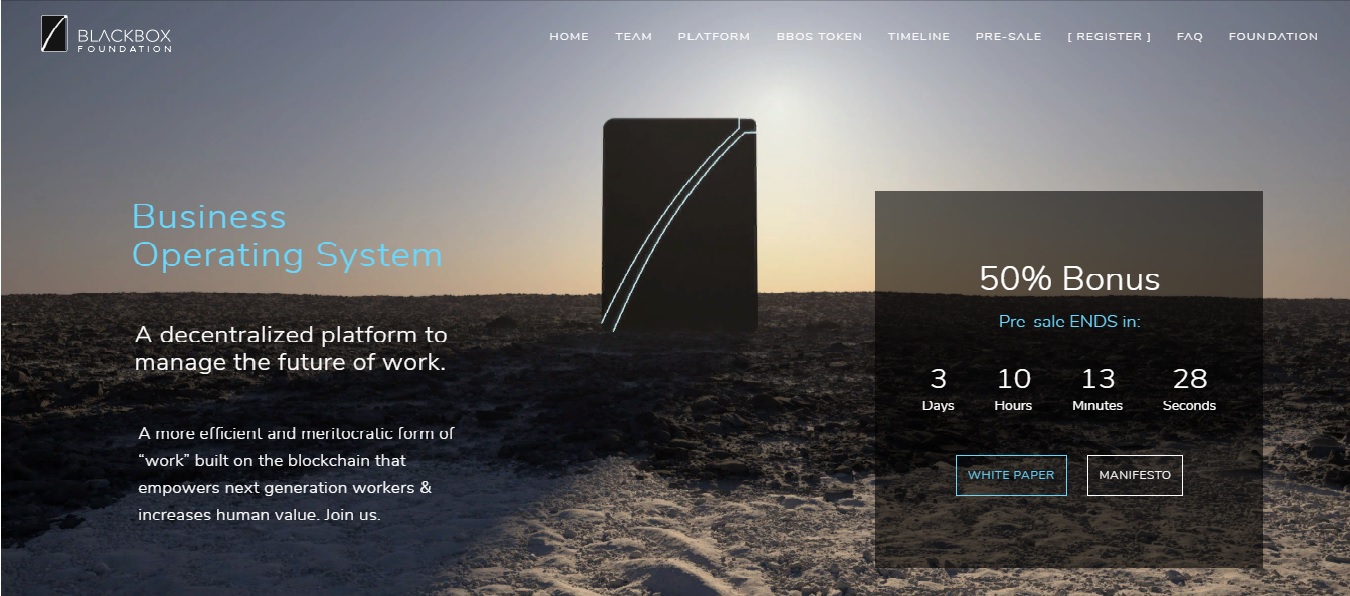 Blackbox OS (BBOS) - это операционная система для управления распределенными компаниями, командами и проектами на blockchain. Построенный на Ethereum, BBOS - это DApp, который обслуживает внутренних участников, организации-члены и держатели токенов, также известные как Сеть Blackbox. Blackbox - расширяет возможности распределенных работников для достижения новых высот, независимо от их параметров (происхождения, местоположения, набора навыков или социально-экономического статуса).