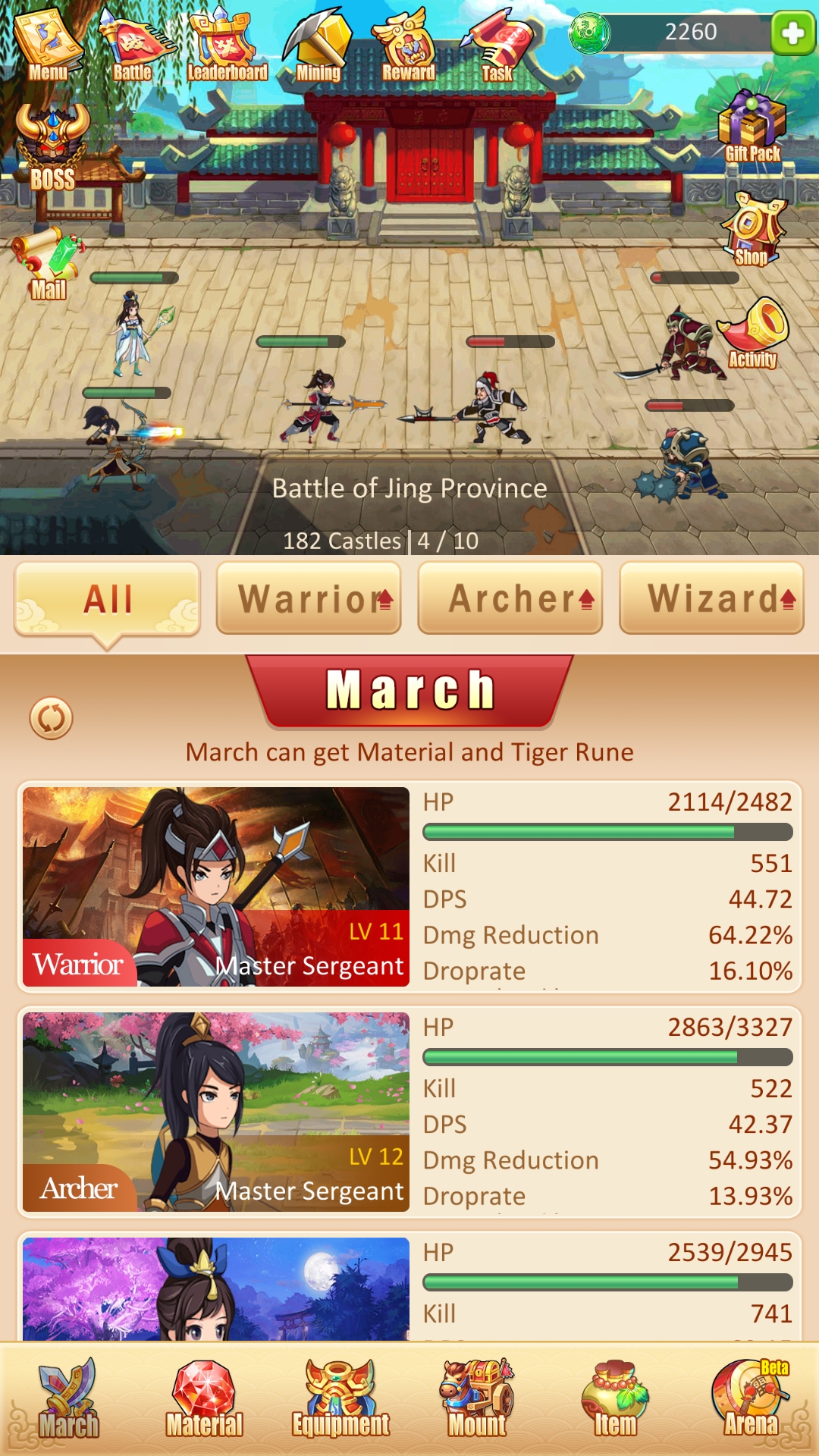 Now that’s out of the way, let’s go over the basic mechanics. You’ll be spending most of the time in combat or ‘Marches’. The game is essentially about a conquest of different lands, so your (up to 3) Heroes need to march and fight. In each round, your Heroes defeat a number of enemies depending on their strength. After every march, each of your Heroes brings back Tiger Runes and material. The more enemies they kill during a march, the more Tiger Runes and the better material you can get. The material you get is actually randomized, but more kills give you higher chances to find more valuable material. In addition, these drop rates depend on the Luck attribute of your Heroes (the higher, the better).