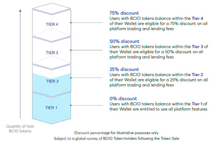 ● Discounted trading: Any transactional fees made with the platform token, that is; BCIO token, will attract a discount on the commissions. However, disciunt sizes will be based on the amount of BCIO token held by the user and this is made possible via a tier system available on the platform. See the image below