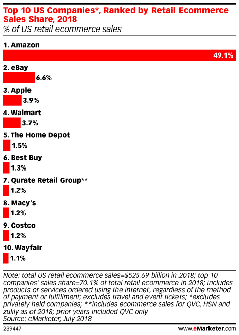 In 2018 Amazon’s share of the e-commerce market was nearly half. Yes, you read that correctly. According to market research company eMarketer, Amazon accounted for 49.1% of all U.S. ecommerce sales. This is just one example of the dominance that the Big Tech companies have over their industries. In fact, Amazon and the other Big Tech companies have become so large and so dominant over their industries that politicians have begun to call for the companies to be broken up. The increasing influence they have as well as monopoly fears are often presented as reasons. However, although Amazon has by far the largest share of the e-commerce market in the U.S., there are a small number of other companies that have a pretty big share of the market as well. Here is a list of the top 10 U.S. companies ranked by U.S. retail e-commerce share in 2018.