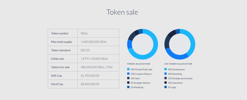 Semua kontribusi harus dilakukan di Ether (ETH). Total pasokan DEAL maksimum adalah 1,44 juta dan setelah itu tidak ada token lain yang akan dikeluarkan. Pada akhir periode penjualan token semua token yang tidak berguna akan dibakar secara permanen.