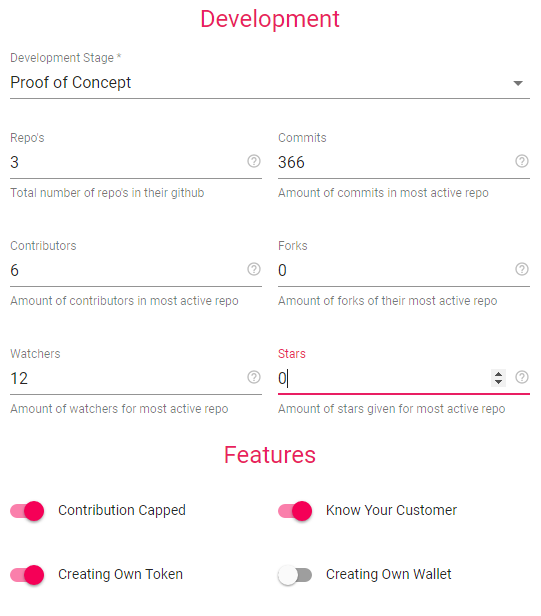 All filled in, next some basic features, did they cap the max contribution (I can’t find this answer, so marking it no), they did do KYC, they are making their own token, and they are creating their own wallet.