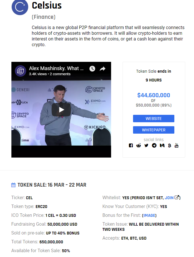 So today we will be looking at Celsius, you can head over to their website (https://crowdsale.celsius.network/) or you can head over to ICO Drops (https://icodrops.com/celsius/) I prefer ICO drops because they consolidate all the data in a very favourable way.