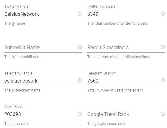 @CelsiusNetwork, and 3349 followers, so we input those, no subreddit, so we leave it blank