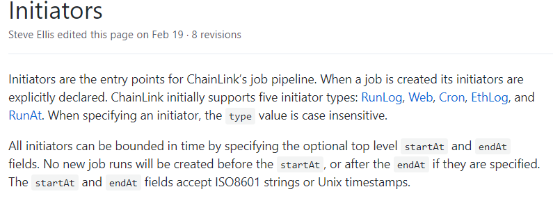 Going over their wiki, I saw something I really liked though (which wasn’t covered in the whitepaper), there are 5 ways to trigger a ChainLink job, RunLog, Web, Cron, EthLog and RunAt.