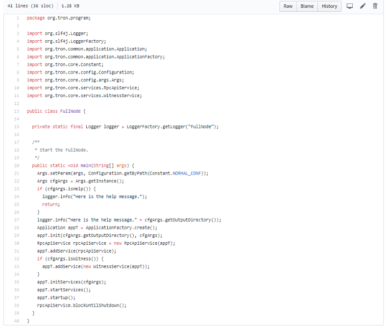 Full Node, this is the entry point for running a node, just starts up an Application object from org.tron.common.application.*, will have a look at it just now, there are no help guides here just yet, still very much dev only, so this isn’t at any production level ready yet, but let’s focus on the substance for now;