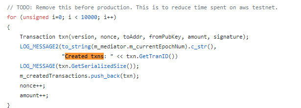 Ok, changed back to 1, and we took 13 seconds. We have a look again at the line calling the transaction, looks straight forward enough, sends the message to the node.