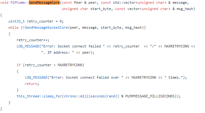 Just another nested loop, now we are looking for SendMessageSocketCore, I’m not a fan of the sleep here, especially not with the random modulus PUMPMESSAGE_MILLISECONDS, but let’s first hunt down SendMessageSocketCore