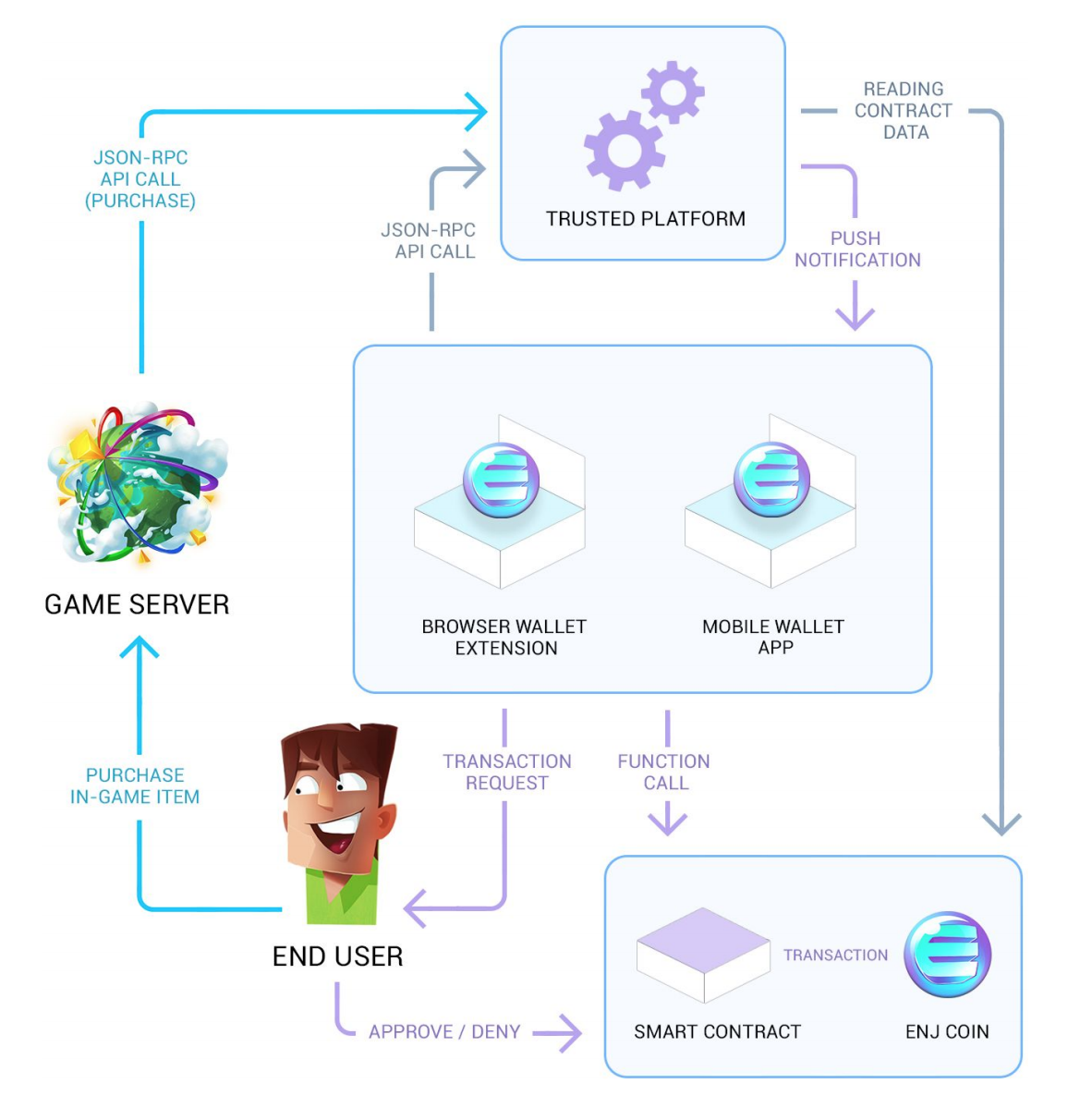 This is an example of how a transaction works for a user for a typical "in-game purchase scenario". Enjin has been able to implement the Ethereum blockchain through their cryptocurrency token, and use the Ethereum network to help build their community.