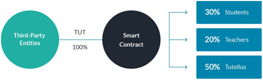 The teacher or students will be paid their reward tokens between 60 and 120 days. in the area of trading the STUT earned for the monetization of the platform, STUT can only be traded for TUT but cannot be the other way round. This trading of STUT into TUT will only be done after one has successfully furnished a course and will be limited to 50% of the total number of STUT earned during the course.The companies may gain access to the best profiles by buying TUT tokens so as to get the students with the best performances in their courses that fit in the vacancies in their organization. Using the smart Contract to distribute the tokens, 30% will go for the students with the proper profile, 20% for teachers associated with them and 50% for Tutellus as shown below.