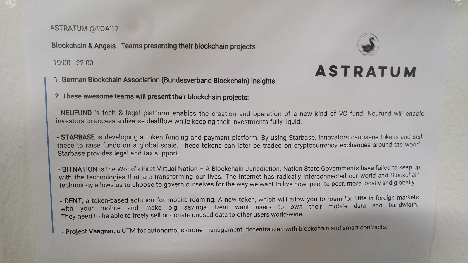 작년(https://www.linkedin.com/pulse/blockchain-angels-berlin-tech-open-air-2016-astratum-outlier-laepple)과 마찬가지로, 올해도 많은 블록체인 기업가들이 그들의 사업을 엔젤투자자와 혁신가들 앞에서 소개했습니다.