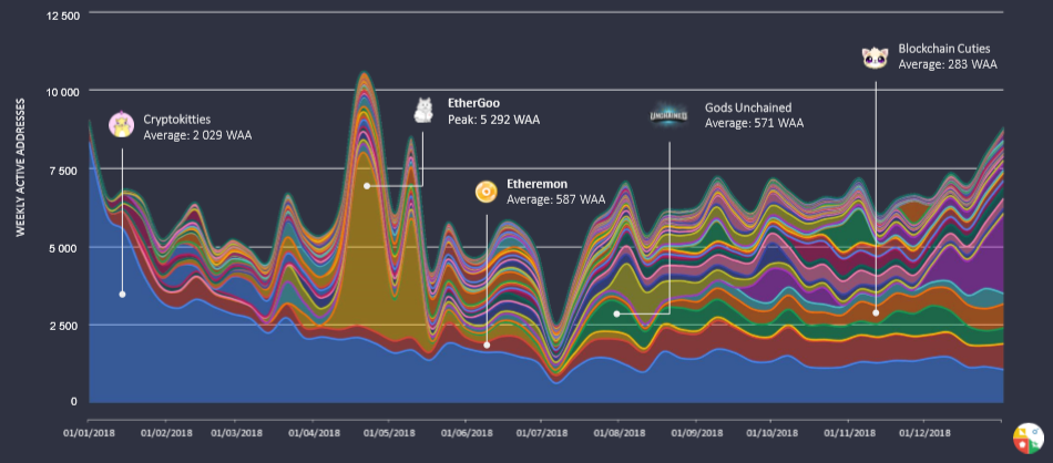 C'est fou non ? La question qu'on se pose tou(te)s en voyant ce graphique, c'est évidemment : mais qu'est-ce qui a bien pu faire monter le nombre de transaction à ce niveau là ? Et bien la réponse se situe dans 5 jeux vidéos qui sont sortis du lot et ont connu des pics d'utilisation. Le populaire Cryptokitties a été dépassé par EtherGoo, ETH.Town et Etheremon (pour ne citer qu'eux) en nombre de transaction.