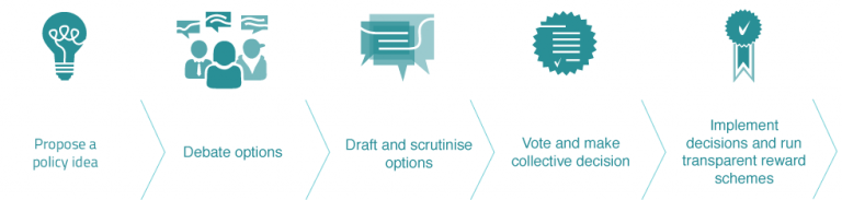 The D-CENT tools enable citizens to be informed and get real-time notifications about issues that matter to them; propose and draft solutions and policy collaboratively; decide and vote on solutions and collective municipal budgeting; and finally implement and reward people with blockchain reward schemes. The tools can be combined in ways to support democratic processes.