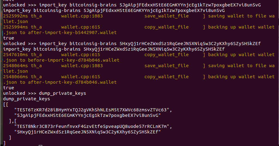 Now lets import the keys into our wallet under our account, and we can double check by dumping the private keys