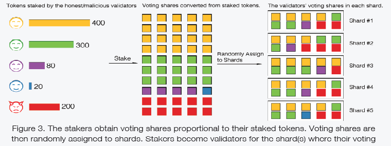 The best way to prevent this attack is to make sure that an attacker is any able to focus their hash-power unto a single shard. Proof-of-Stake allows Harmony to easily and effectively through the use of random sampling, take away an attacker’s ability to focus their hash power on a single shard. This eliminates the 1% attack vulnerability. Moreover, in Harmony, to assign a group of consensus validators to a shard, nodes are randomly assigned to a shard as shown below: