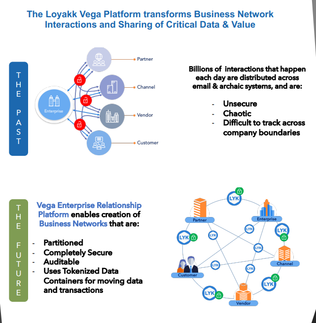 These business challenges will be addressed in a comprehensive manner through Loyakk's patent-pending blockchain-enabled Vega Enterprise Relationship Platform. Importantly, Loyakk Vega will be an enterprise-grade platform customised for secure business-to-business engagement featuring permissioned sharing of data, standardized communication interfaces, efficient value transfers based on smart contracts and consistent propagation of business rules & security policies.