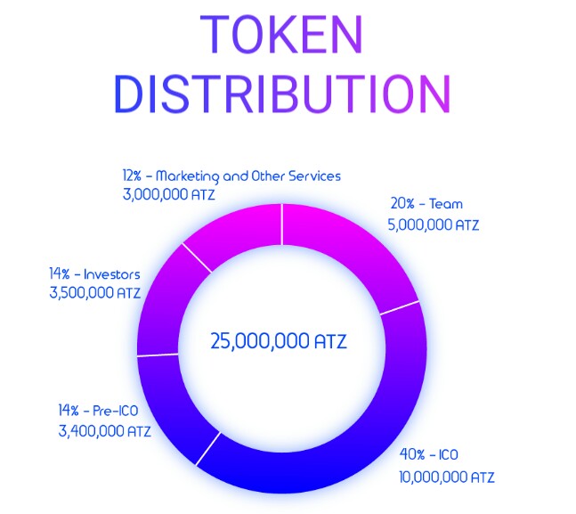 Atomz's token, ATZ, is an ERC20 token with a total distribution of 25,000,000 ATZ tokens. 3,500,000 tokens will be kept for private and for pre-ICO investors each, while 8,000,000 tokens will be offered during the main ICO. Purchasing mutual funds and accessing the dashboard, the tokens posses few utilities, locking unsold tokens until the platform release.