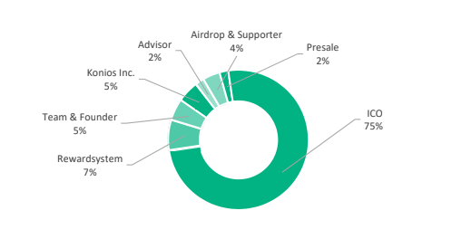 La distribución de tokens y los ingresos de Konios se generarán en porcentaje compartido. Para los tokens, el 75% se ofrecerá en ICO, el 7% se ofrecerá como sistema de recompensas, el 5% para el equipo y el fundador, el 5% para Konios Inc, el 4% para android y el seguidor, el 2% para el asesor y el 2% para venta. Mientras tanto, los fondos recibidos se dividirán para el 54% de la división de desarrollo, publicidad en un 25%, para un 10% de uso de liquidez, RR.HH. y Marketing 5%, Administración 5% y para la parte legal 1%.