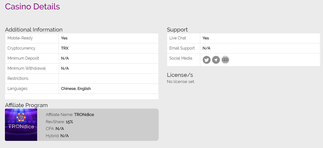The ranking section is followed by an elaborate review of the platform showcasing registration funnel, what makes the casino special, and most importantly their bonuses and promotions. In this specific case, TRONdice has displayed only referral bonus amounting to 15% (for every bet your referee makes), and other bonuses are varying.