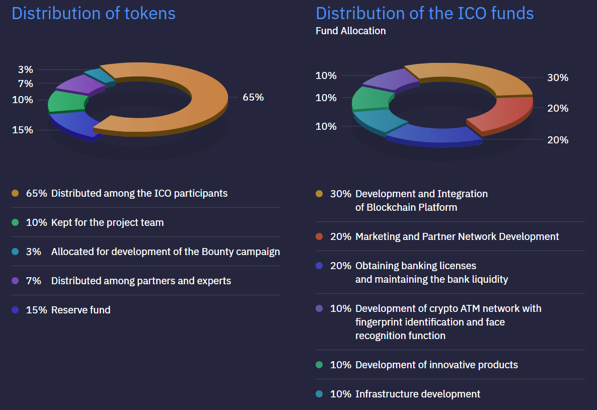 To conduct transactions in cryptocurrencies there will be virtual cards: Visa, Mastercard and UnionPay. Furthermore, there will be mobile services such as Apple Pay, Samsung Pay and Android Pay. It will let you pay via common POS-terminals supporting PayPass, payWave, QuickPass, websites and also allows to withdraw or input cash in ATMs.
