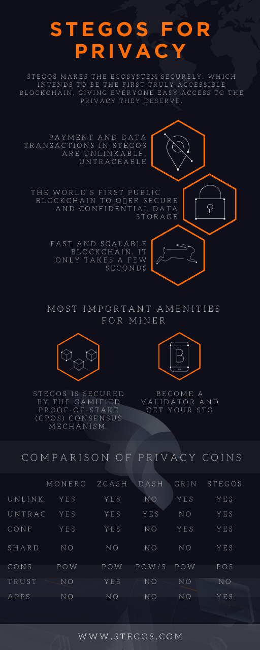 Stegos makes the ecosystem securely. Which intends to be the first truly accessible blockchain, giving everyone easy access to the privacy they deserve.