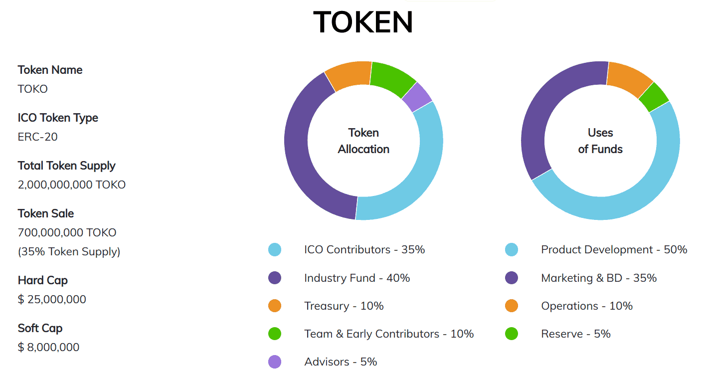 Among other things, the platform will have its own token. It will be used to conduct internal settlements between companies and banking institutions that become members of the system. The TOKO token is based on blockchain ether, using the ERC 20 standard. At the moment, the developers are working on creating their own blockchain, and then it will be transferred to the token itself. The team promises that blockchain will have high translation speed and excellent scalability.