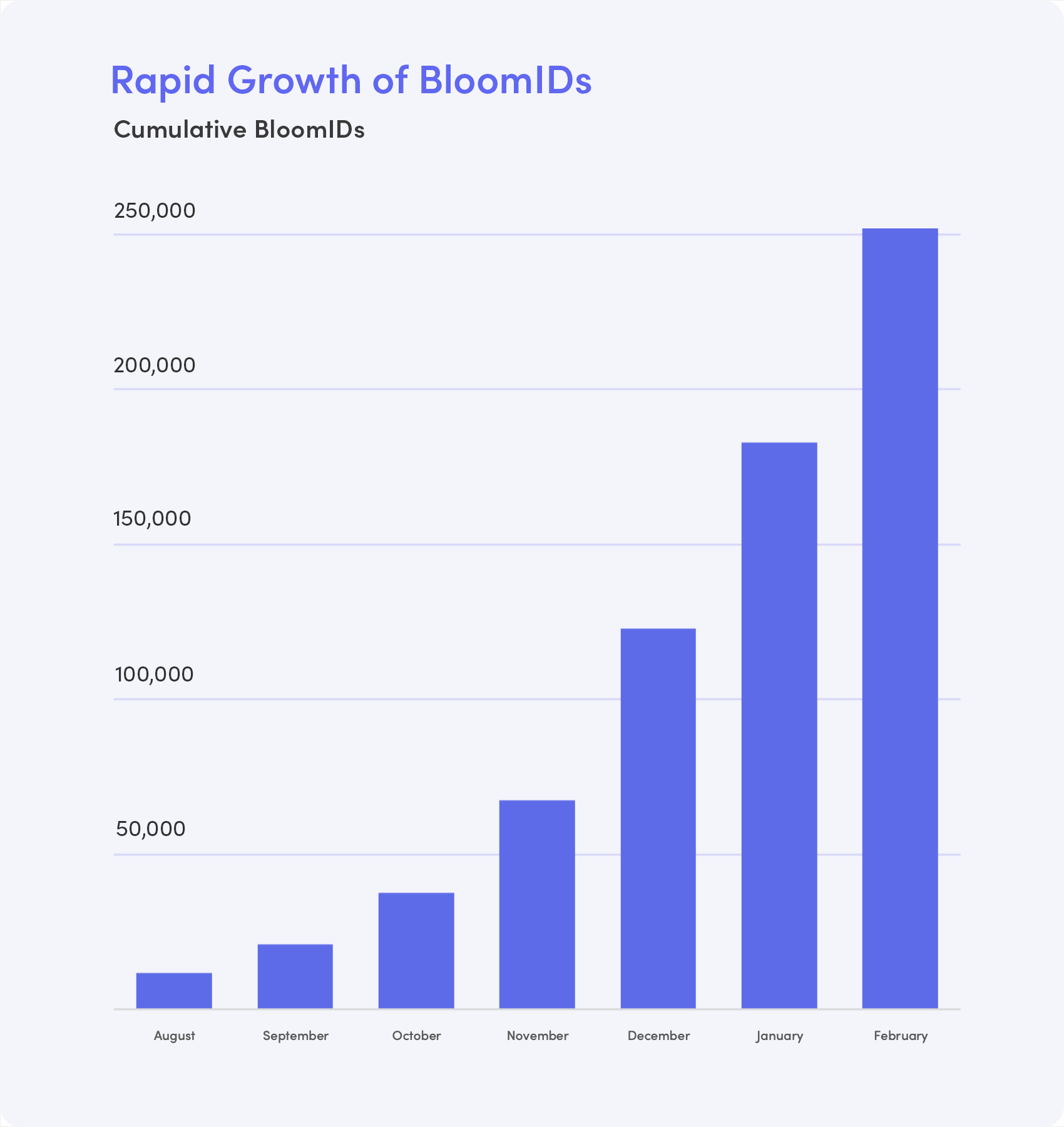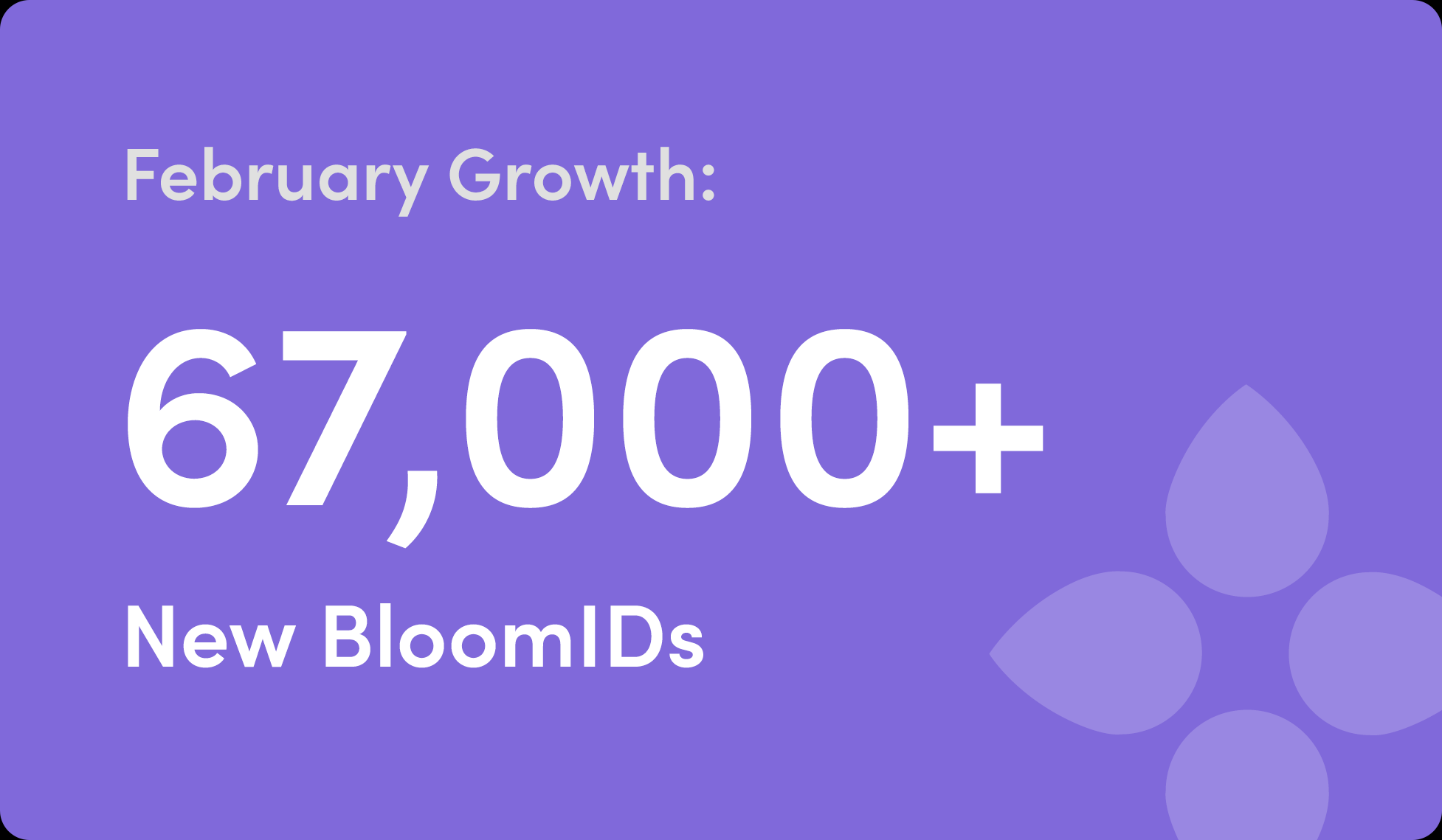 Following six months of rapid growth and record highs, February marked a historic month for Bloom with more than 67,000 BloomIDs created, the largest number ever of new BloomIDs in a single month. February also brought a record best for BloomIDs created in a single day, with more than 7,500 created on February 5th alone. Bloom is now by far the largest decentralized identity management system in the world, enabling hundreds of thousands of people around the globe to protect their data with the latest in blockchain technology.