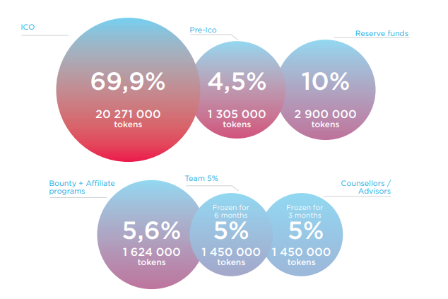 As we can see in the diagram above, it can be seen that as much as 69.9% will be allocated to ICO, as much as 4.5% will be allocated to pre-ico, as much as 10% will be allocated to reserve funds, as much as 5.6% will be allocated to bounty + affiliate programs, as much as 5% will be allocated to the team, the remaining 5% will be allocated to counsellors / advisors.