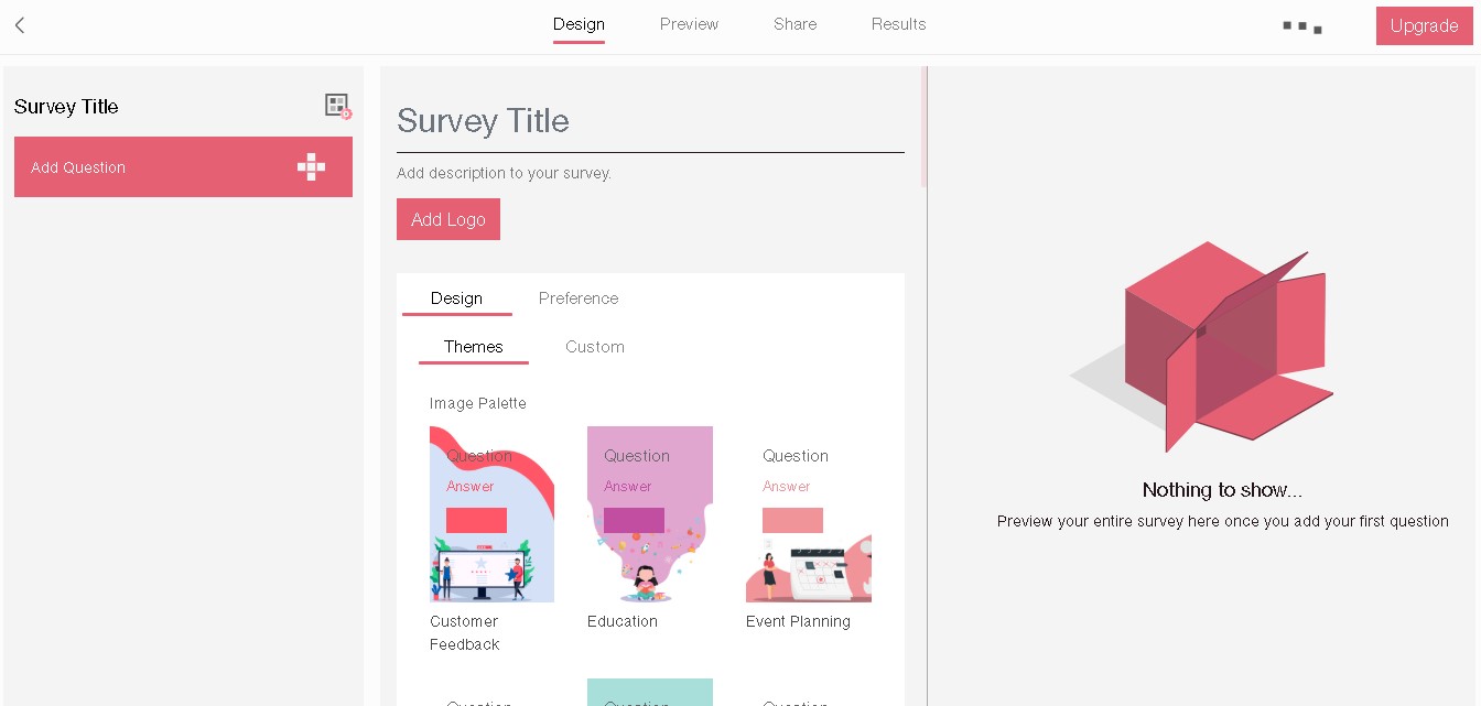 You can write a survey title, add description to your survey, add logo, choose design, themes.
