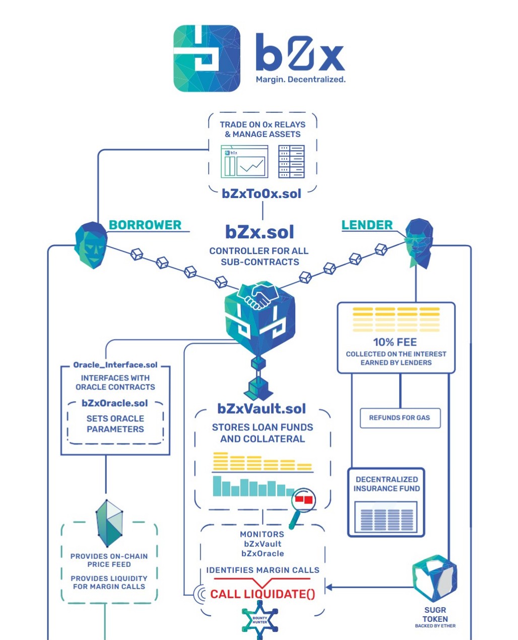 . bZx.js Library : the JavaScript library is used to integrate b0x to extant relays and exchanges, and procreate the front end interface for users to access funding on decentralized Exchanges.