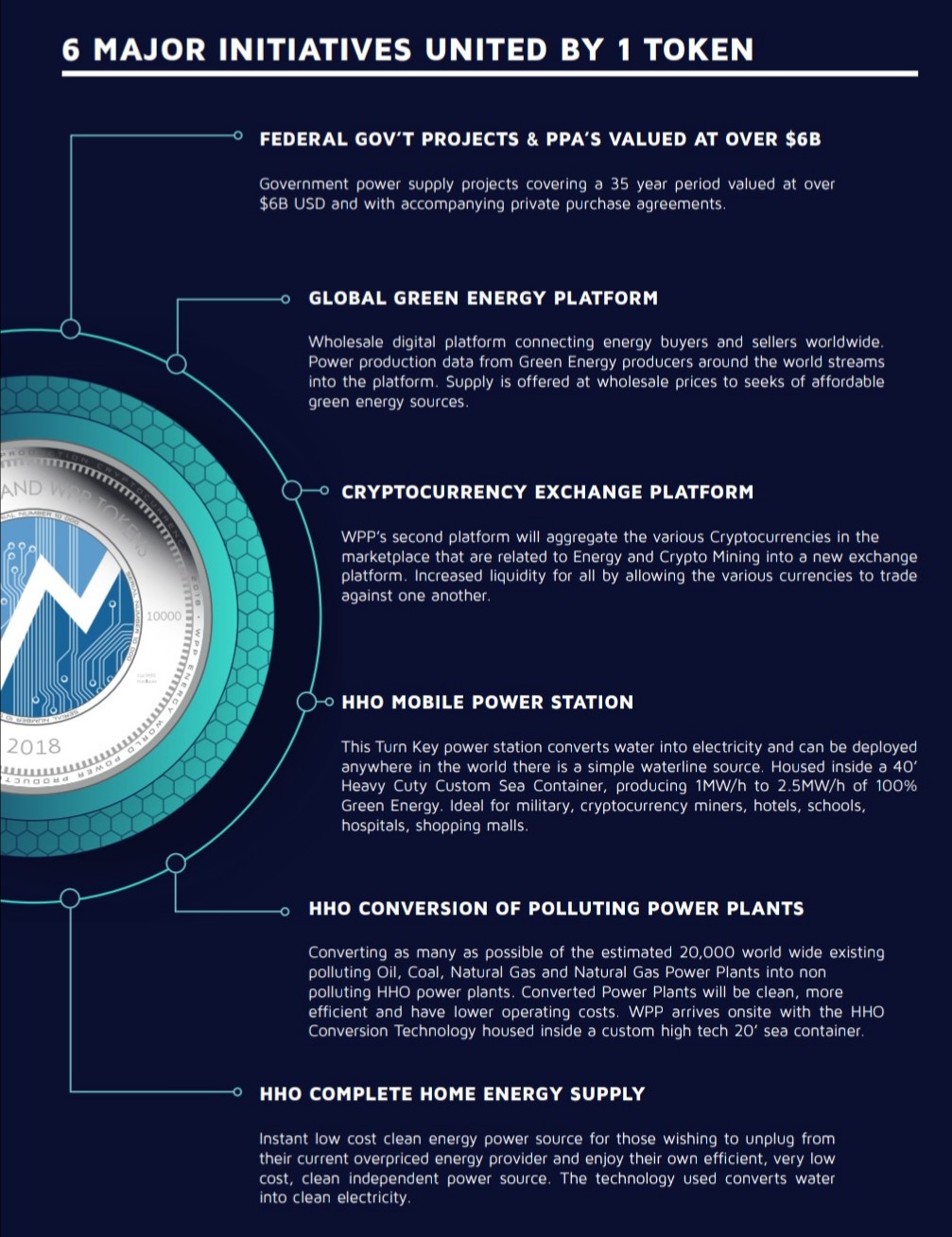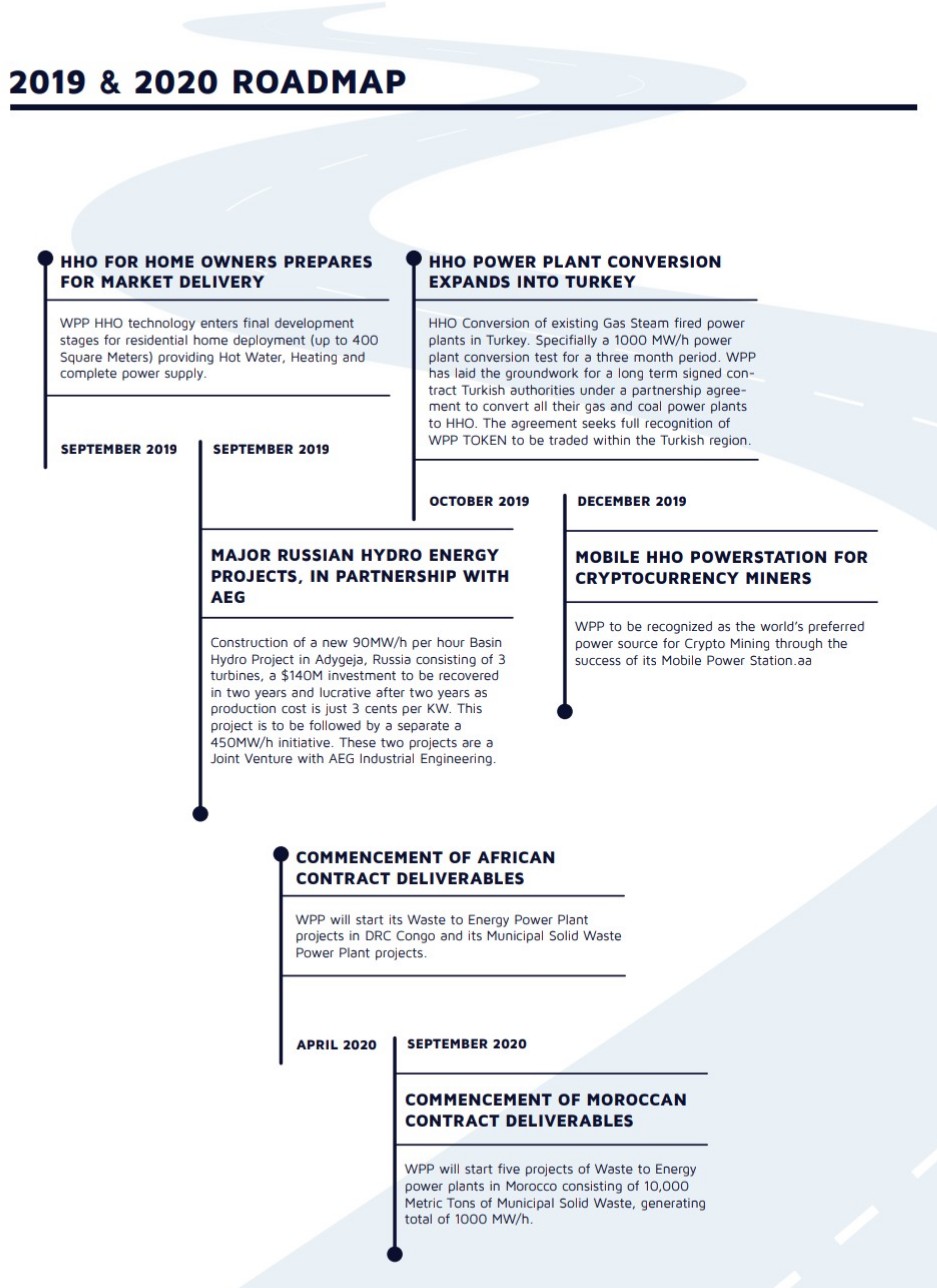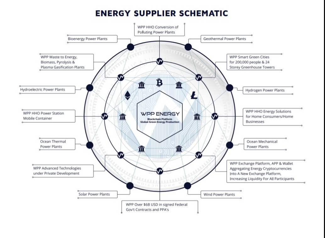 The WPP Energy digital platform will have its focus on securing power production data from green energy producers around the world. This will help to provide power at cheap and affordable prices to consumers around the world. Another sub-category of the WPP Energy digital platform is the exchange platform where cryptocurrency mining and energy exchange will be enabled. This implies that various cryptocurrencies can be traded against one another as well as the various forms of energy available. The green energy technology solution focuses on establishing a mobile power plant capable of producing a very high amount of power which can be distributed to any part of the world using a water-line only to generate this power. Also, the conversion of numerous polluting power plants to non-polluting water-based power plants is in development such that dangerous gases released from these plants into the atmosphere while burning fossils fuels for energy generation will be eliminated thus leaving our atmosphere completely safe and free from dangerous gases.