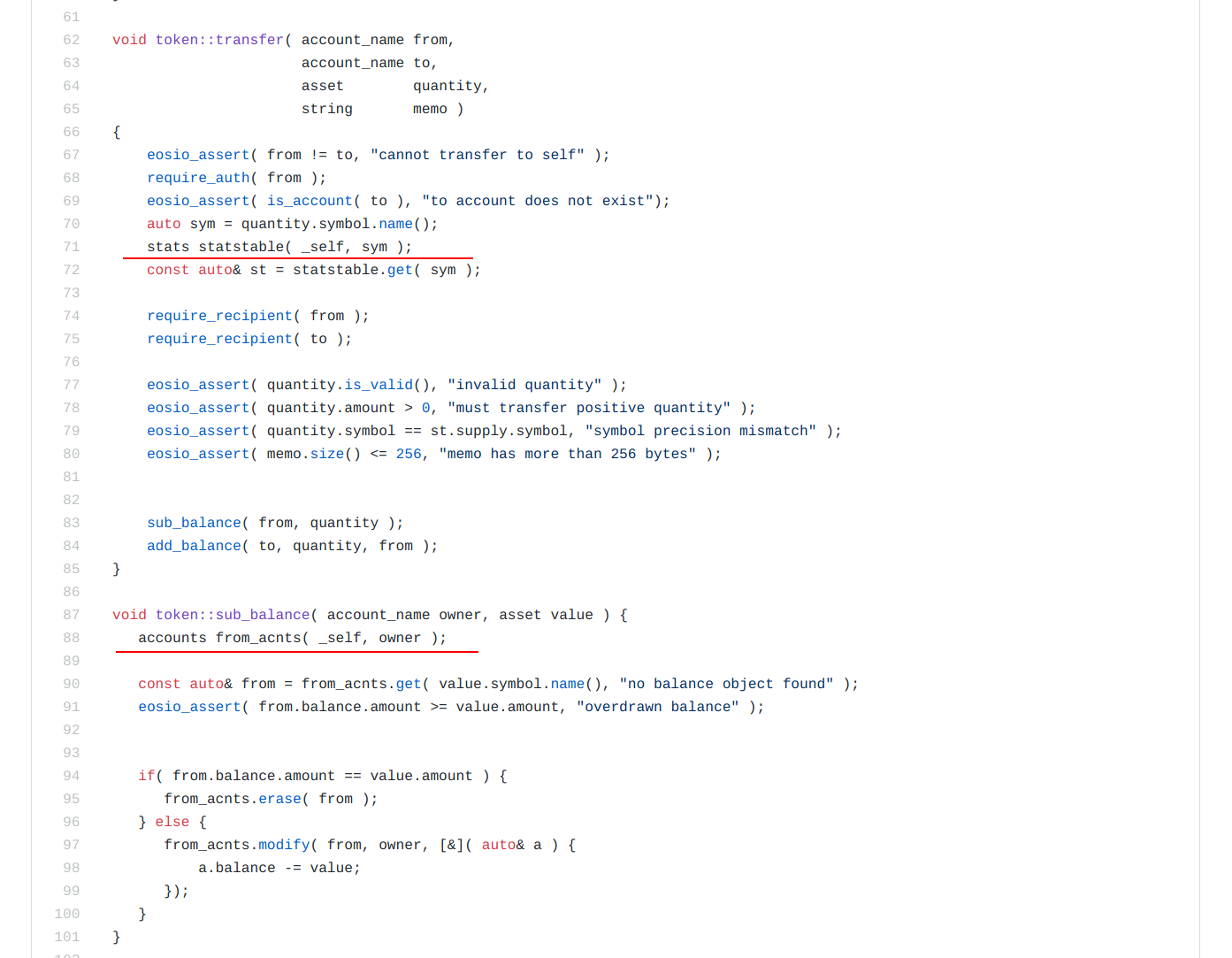 The first underlined part depicts the line that makes the reference to the accounts table when the balance is subtracted during a transaction. This line of code hints that the scope of the table accounts is an account name. For more tutorial and information about using multi-index db within smart contracts, please stay tuned for our next article.