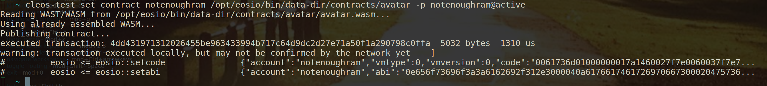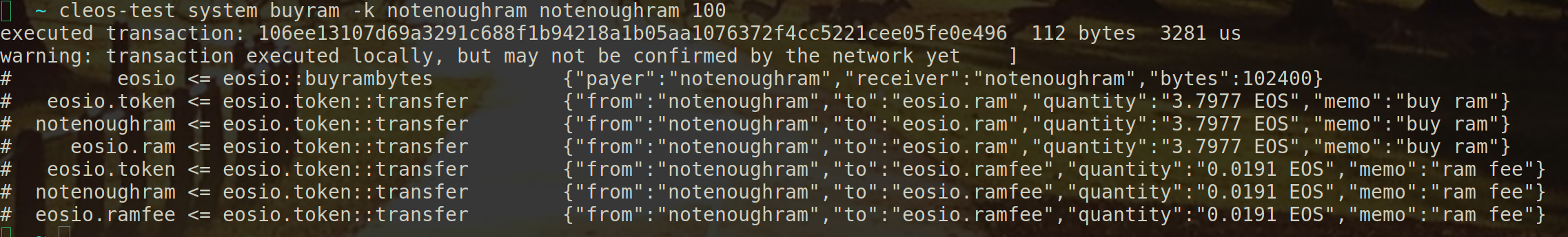 In my example with the smart contract that I wanted to deploy will require around 100 KiB which will cost around 31.70 EOS token. We can then proceed with the actual transaction by issuing the following command through Cleos.