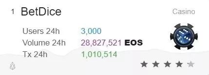 On 9th December,The 24-hour EOS transaction volume of BetDice broke the record, reaching 28827521 EOS, which reached 370 million RMB according to the EOS price of 13 RMB. The number of 24-hour users reached 3000, and the number of transactions within 24 hours was 1010514.