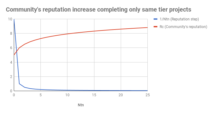uint nextRep = previousReputation.add(reputationStep / completedProjectsByTier);
